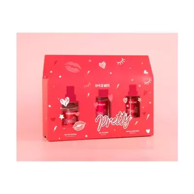 Este conjunto inclui um perfume, um gel de banho e uma bruma corporal.