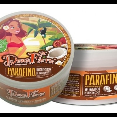 Parafina Bronzeadora de Coco e Urucum Dona Flora, a sua fórmula foi desenvolvida para proporcionar um bronzeado rápido, intenso e dourado, ajuda a hidratar, nutrir e a combater o ressecamento da pele.